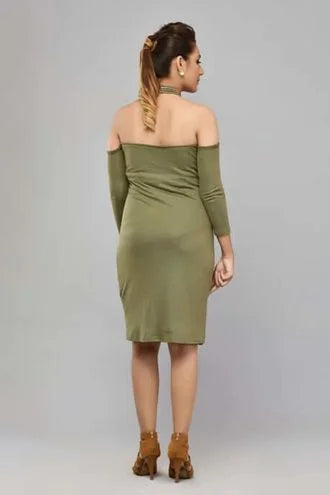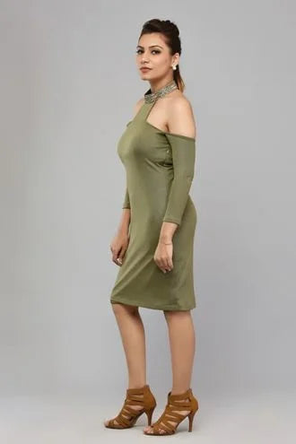 Military Green High Band Dress - Neck Band Embellished with Zircon and Pipe Embroidery.