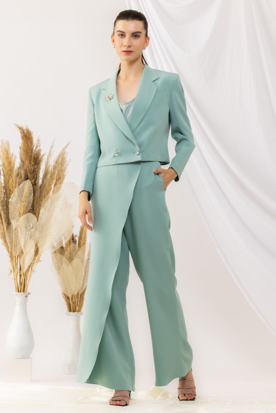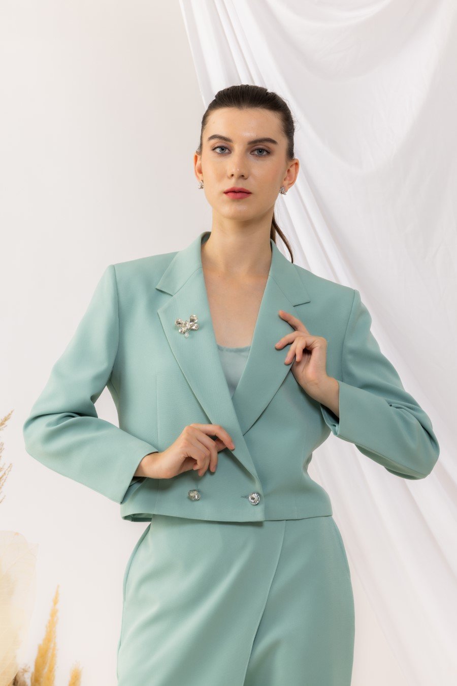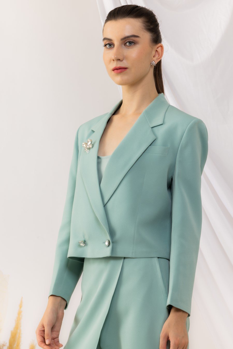 Sea Green Double Breasted Blazer With Crystal Buttons And Brooch