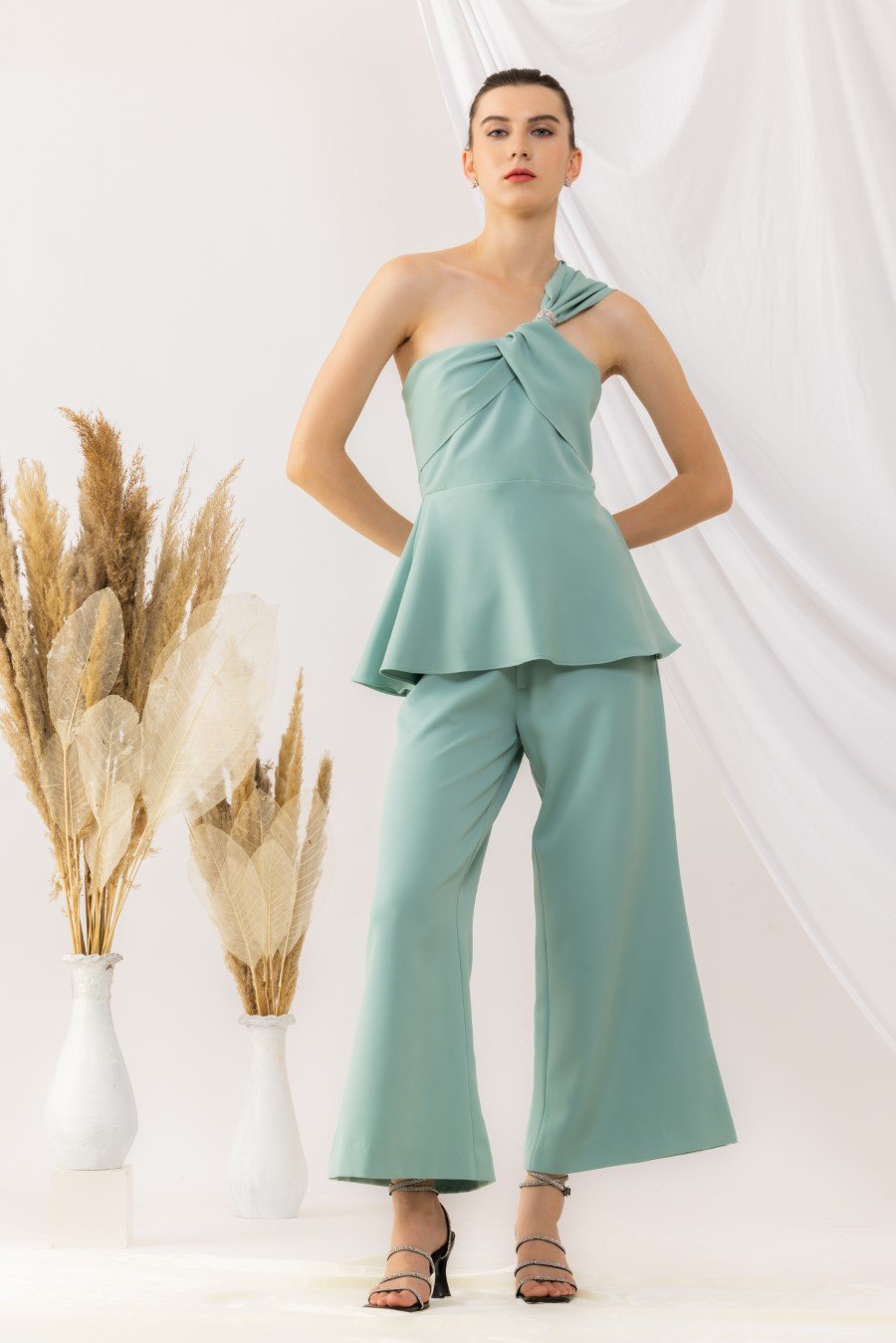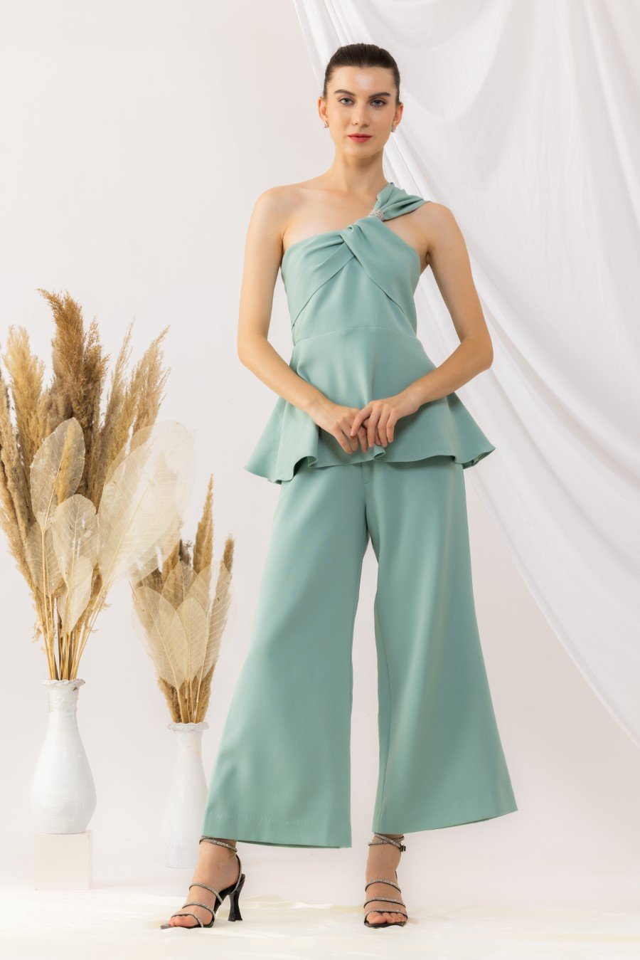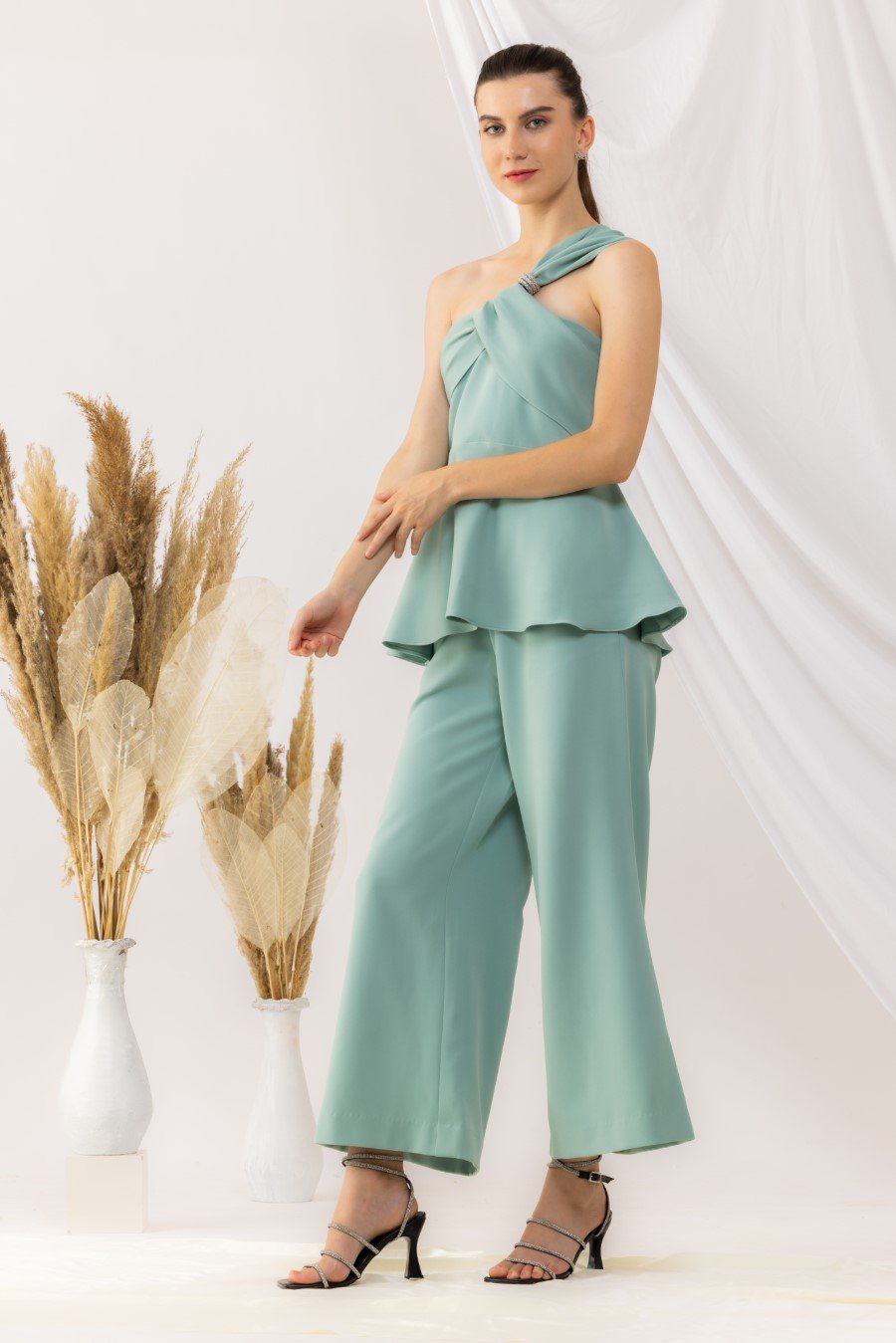 Featuring sea green one shoulder peplum top with embellished diamante around the neckline comes with flared pant in banana crepe. This pant has fix belt with front button and zip. Size Available From XS To 3XL. Style Tip : Elevate this look with statement jewellery and comfortable footwear and your favourite clutch. Care Instructions :