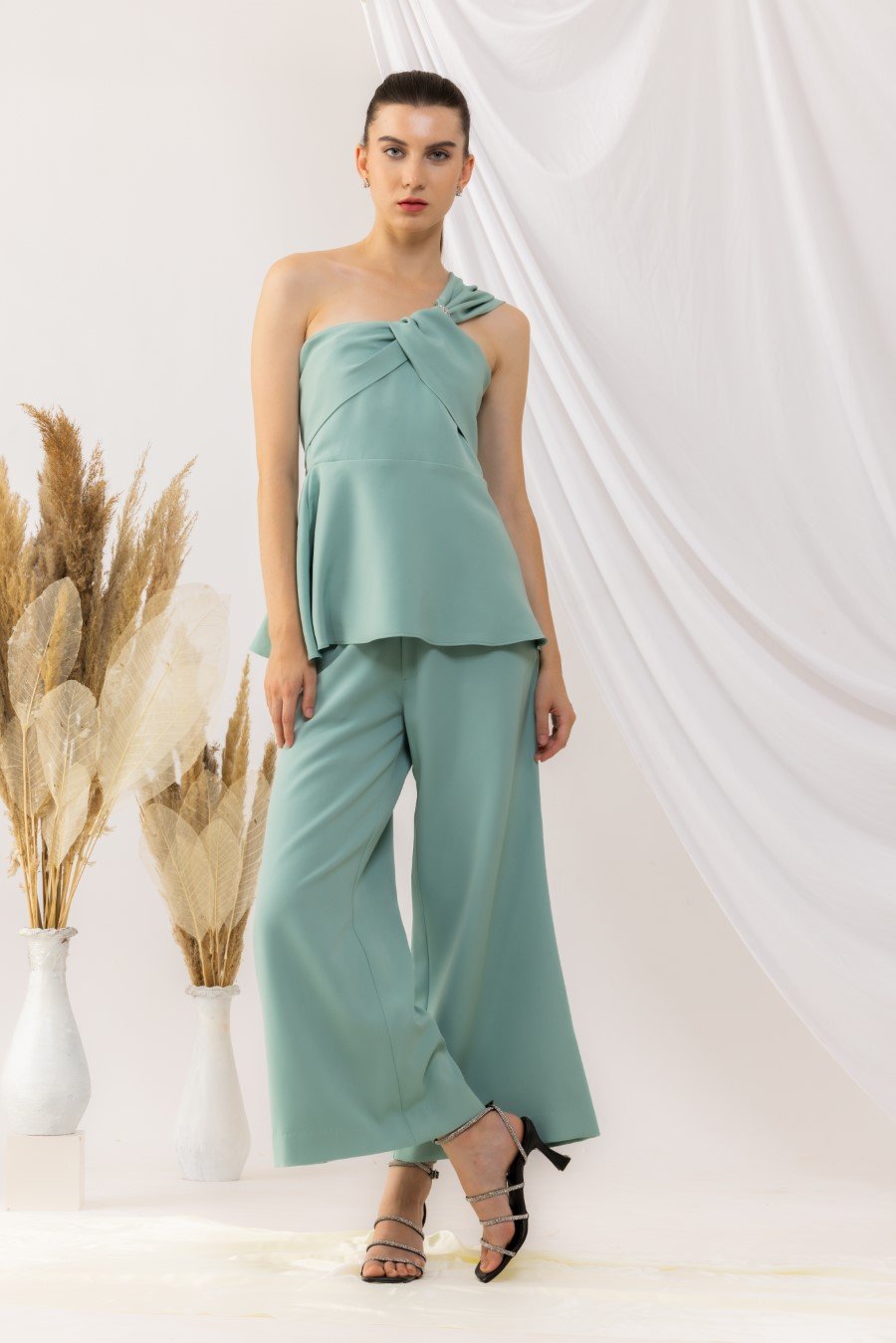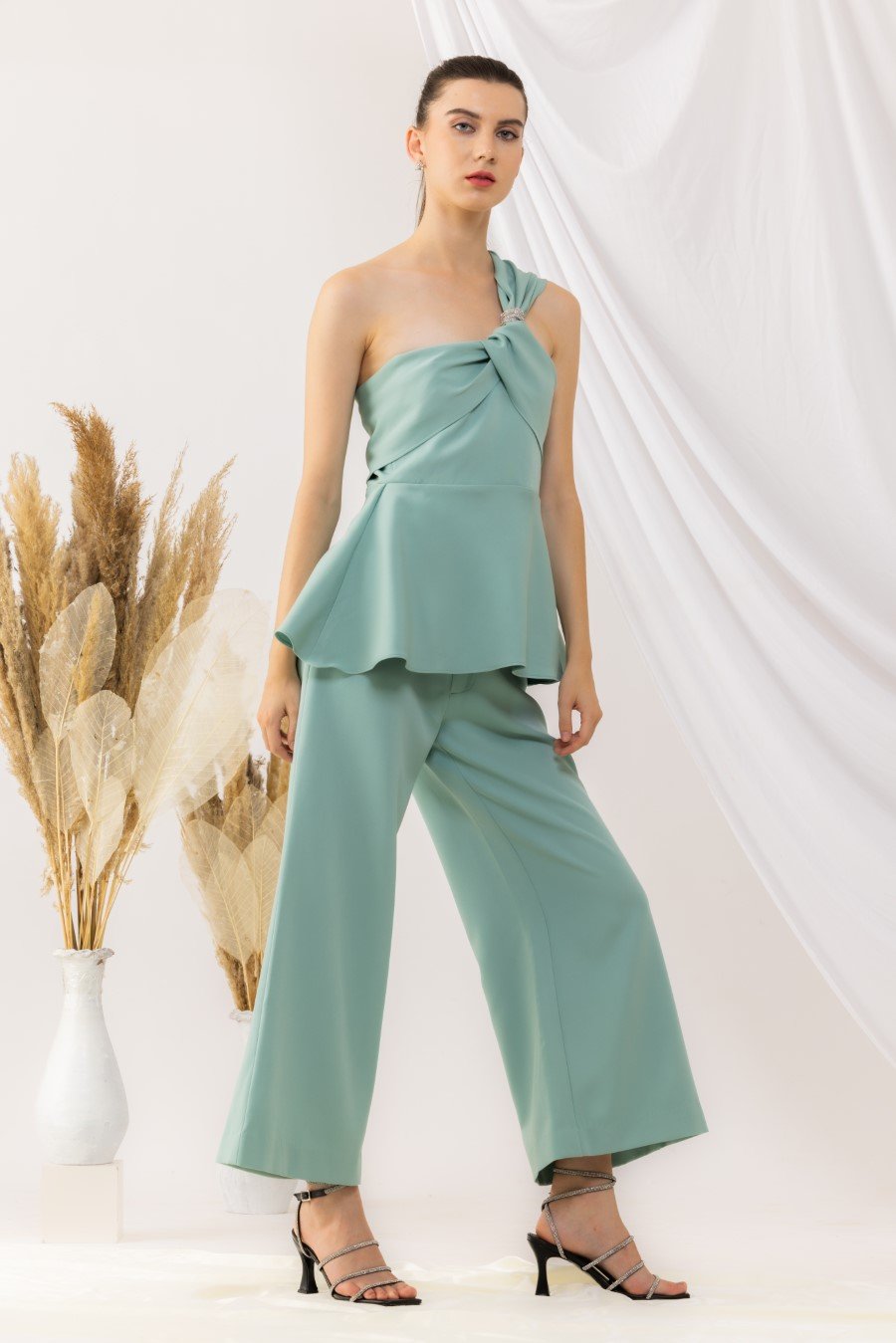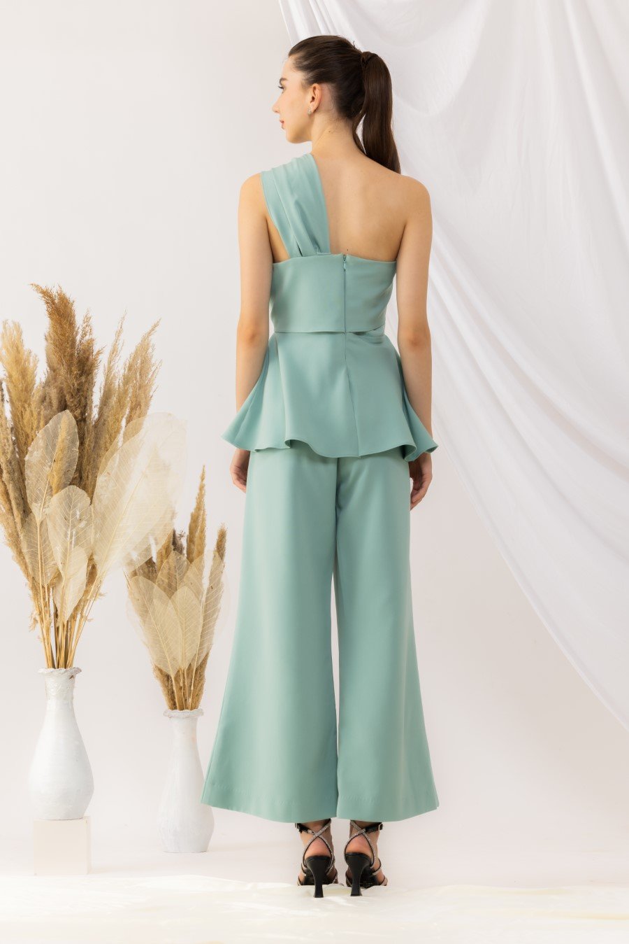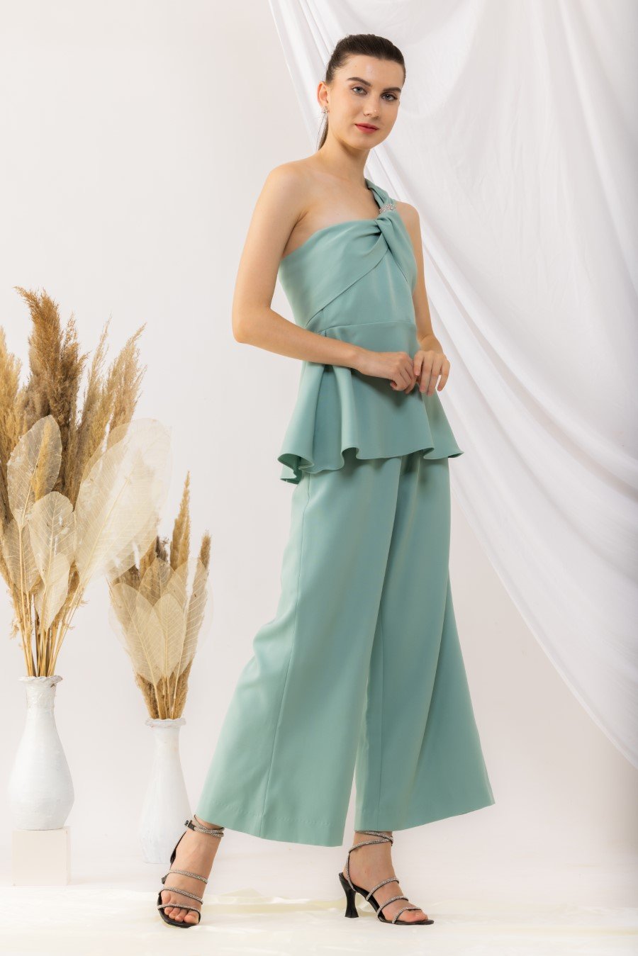 Featuring sea green one shoulder peplum top with embellished diamante around the neckline comes with flared pant in banana crepe. This pant has fix belt with front button and zip. Size Available From XS To 3XL. Style Tip : Elevate this look with statement jewellery and comfortable footwear and your favourite clutch. Care Instructions :