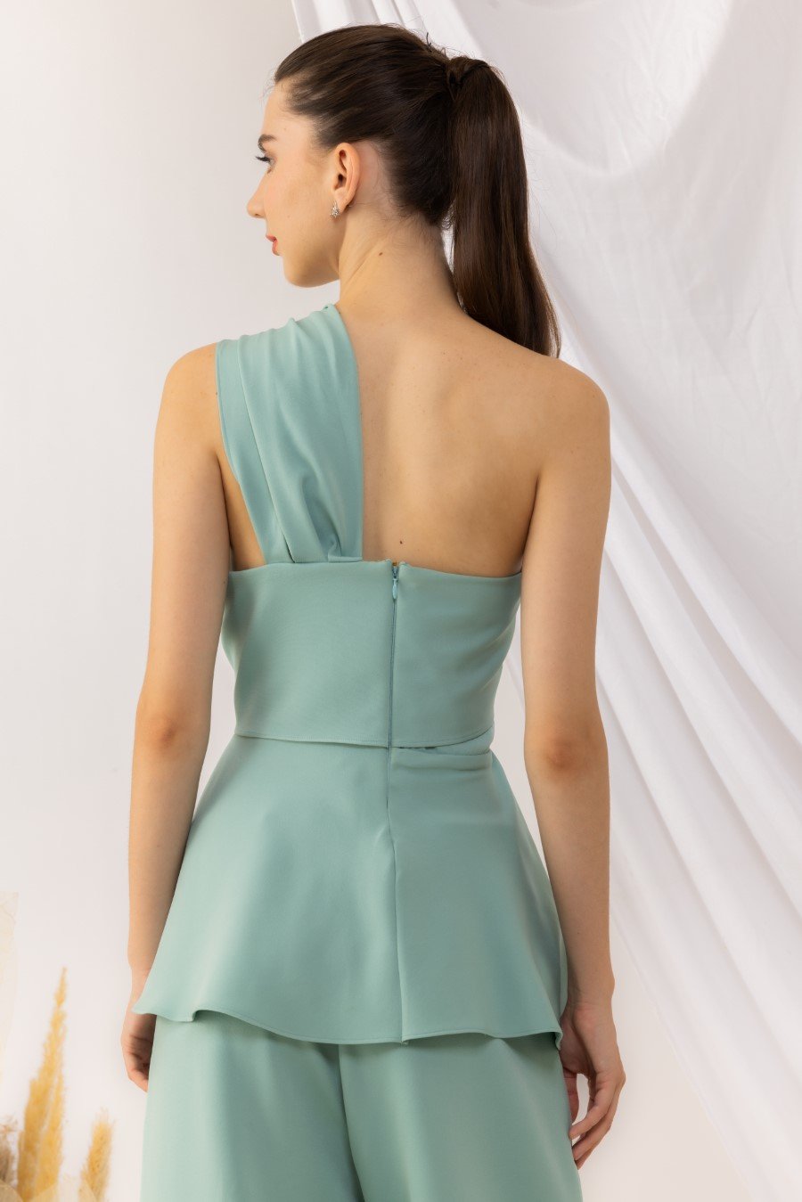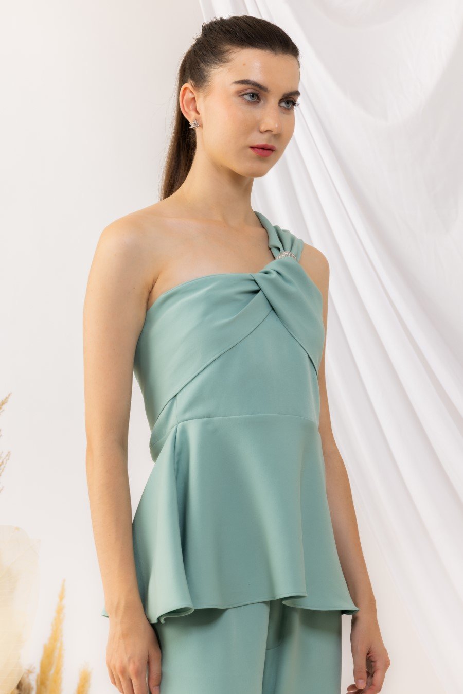 Sea Green Peplum Style Off Shoulder Knot Top With Diamante