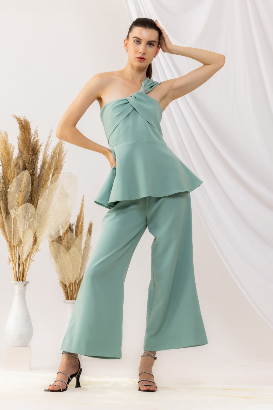 Featuring sea green peplum style off- shoulder knot top in banana crepe. Highlighted with diamante. Size Available From XS To 3XL. Style Tip : Style sea green peplum style off shoulder knot top with co ord pant and your statement Jewellery. Highlight it with your heels and favourite clutch. Care Instructions :