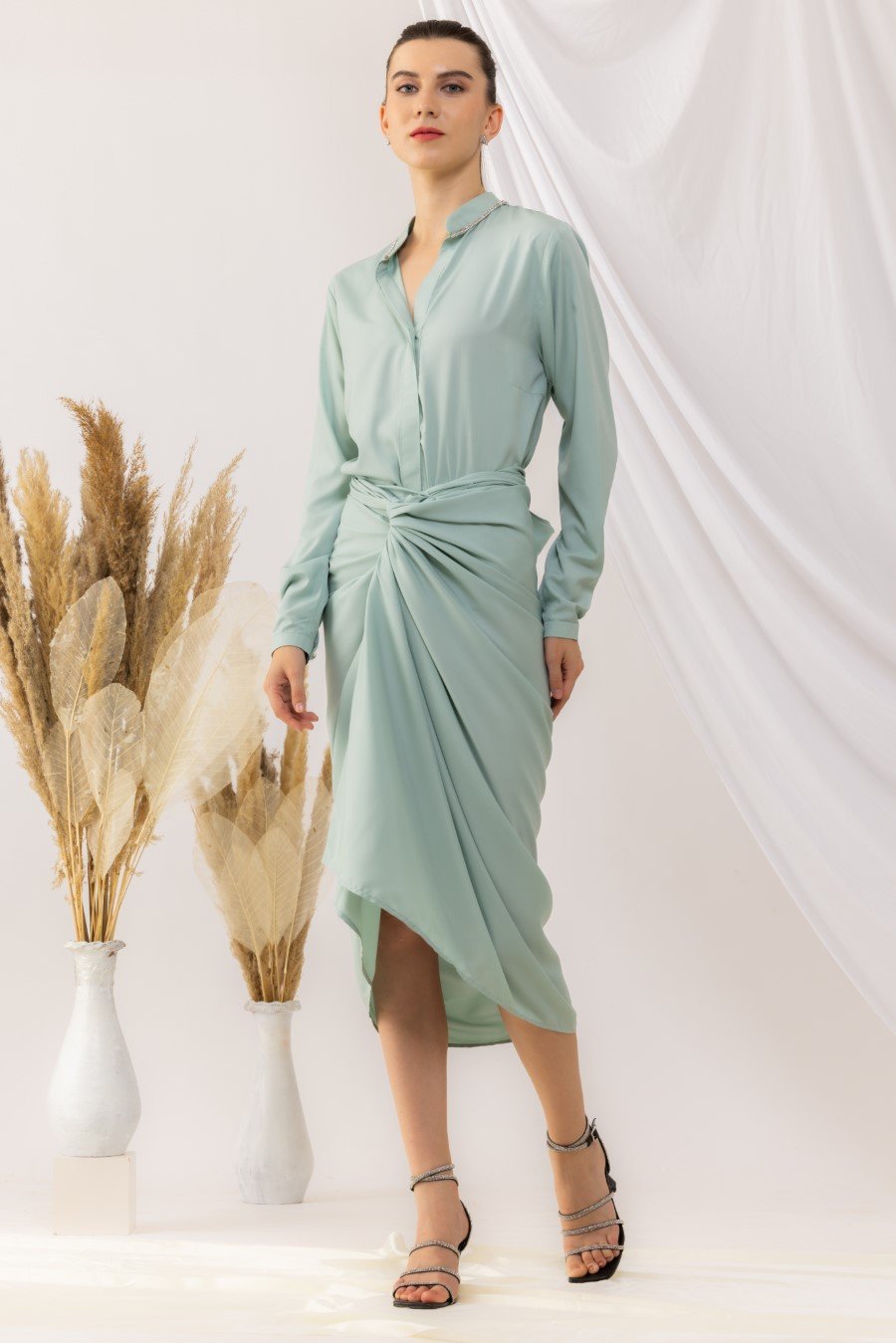Featuring a sea green front button shirt paired with a wrap skirt comes in american crepe. Highlighted with diamante on the collar. The Wrap Skirt Co-Ord Set looks very stylish. Size Available From XS To 3XL. Style Tip : Elevate this look with statement jewellery and comfortable footwear and your favourite clutch. Care Instructions :