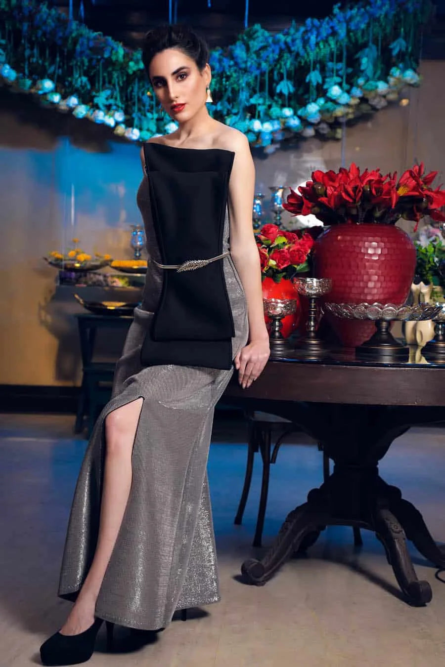 Neoprene silver shimmer fabric long dress with big black bow, has a side knee length slit. Style it with a pretty silver metal belt.