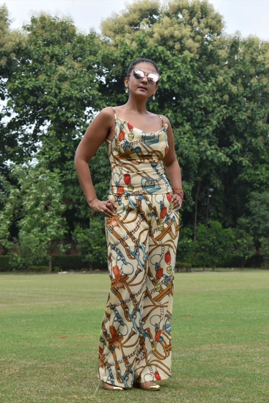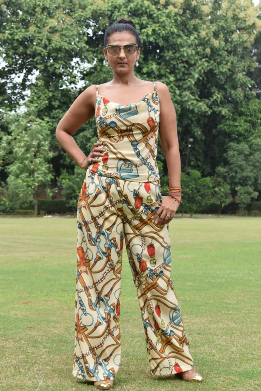 Cord -set with trendy Chain Digital print is itself very attractive and outshine all odds. Strap, cowl neck giving perfect Party look, showing off your collar bone in a stunning way. The flayer in bottom is actually defines over all appearance and making it worth to buy. The fabric Crepe, most popular in summer wear is used keeping in mind to be comfortable yet classy. The print is so amazing that it is a perfect choice to be in your closet.