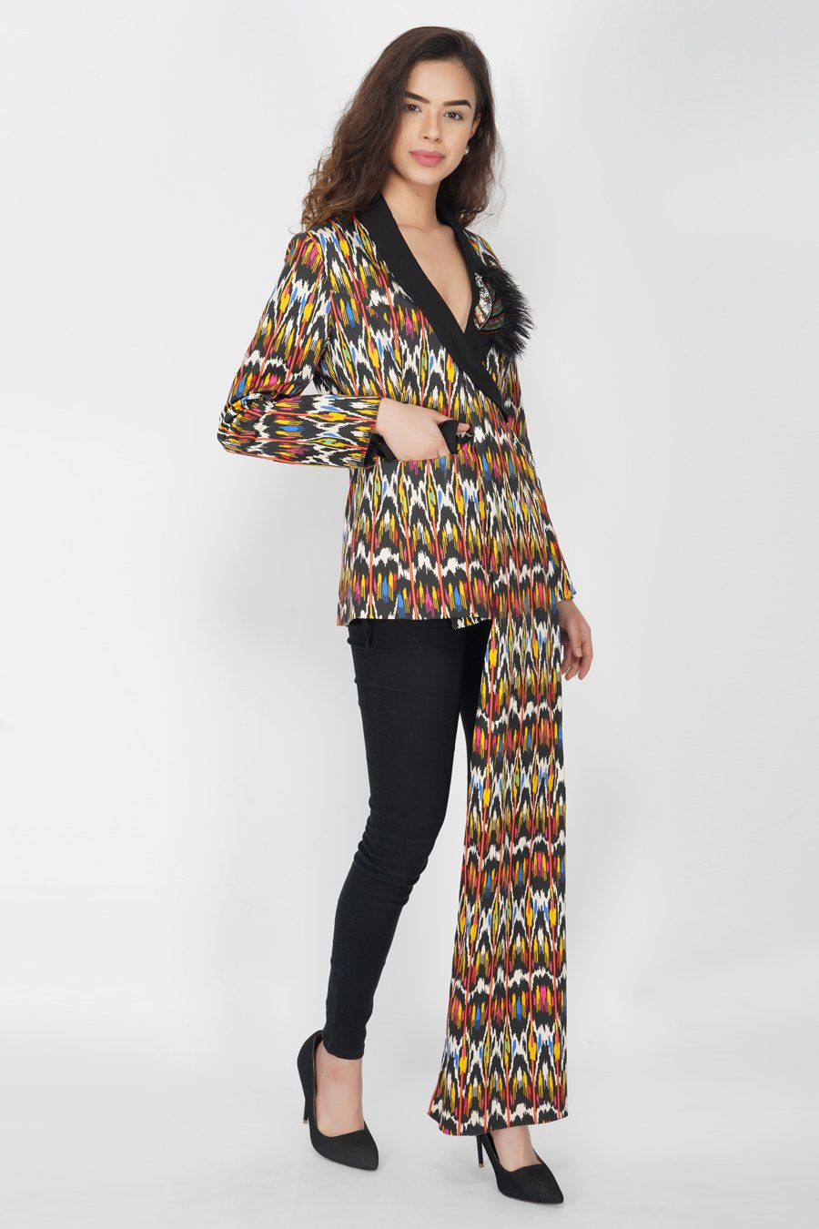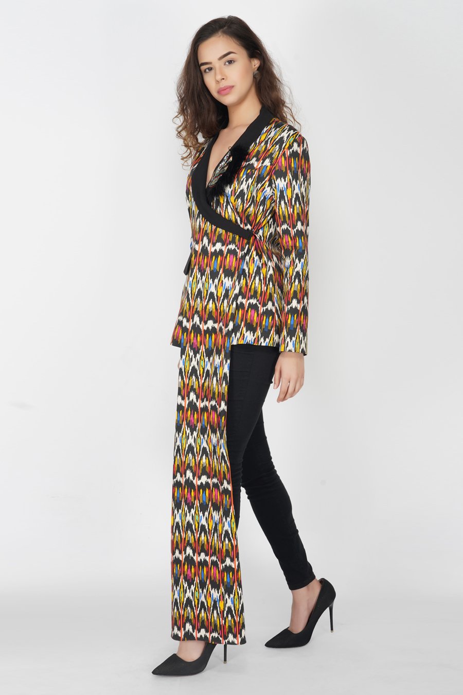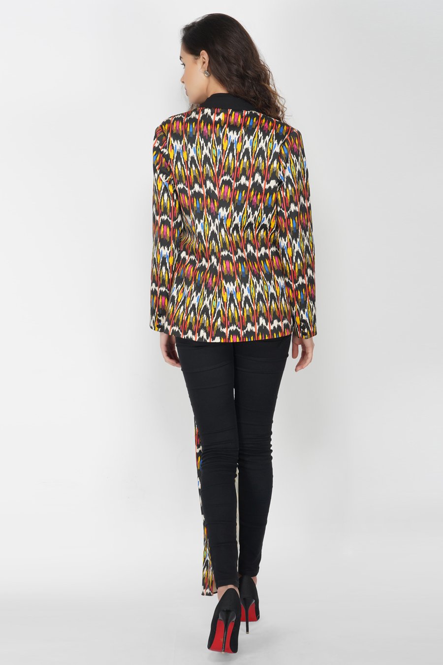 Multi color Ikat print casual blazer, has a notched lapel collar, double-breasted with button closure, long sleeves, one mock flap pocket on the front, has a stylised panel detailing on it and has an attached lining. Complete The Look Buy jackets and blazers for women online at Kovet. It is the perfect pick to stay in style this season. Layer it over a fitted top and team it up with jeans and casual shoes or boots for a chic look. Delivery Time : 10-15 days