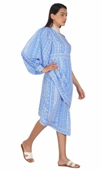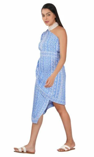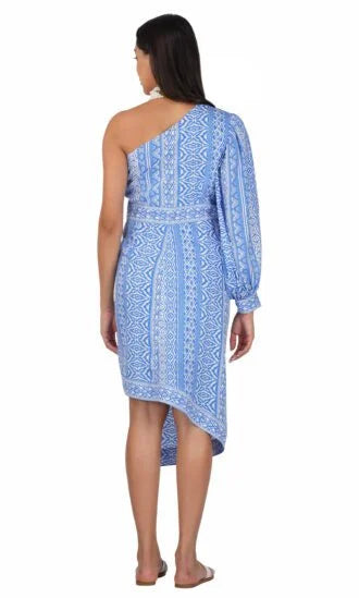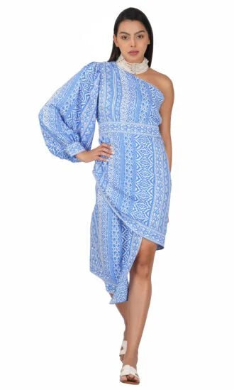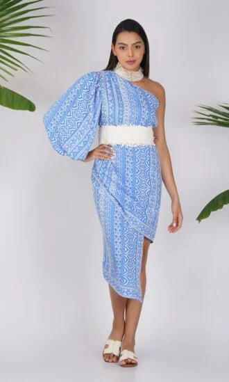This one shoulder dress is, perfect for resort wear. The blue and white printed pattern creates chic look. The dress is made in fine crepe fabric. The bishop sleeve is creating a stylish outfit. The dress has a side zip. The belt is used only for styling. The belt is not for sale.