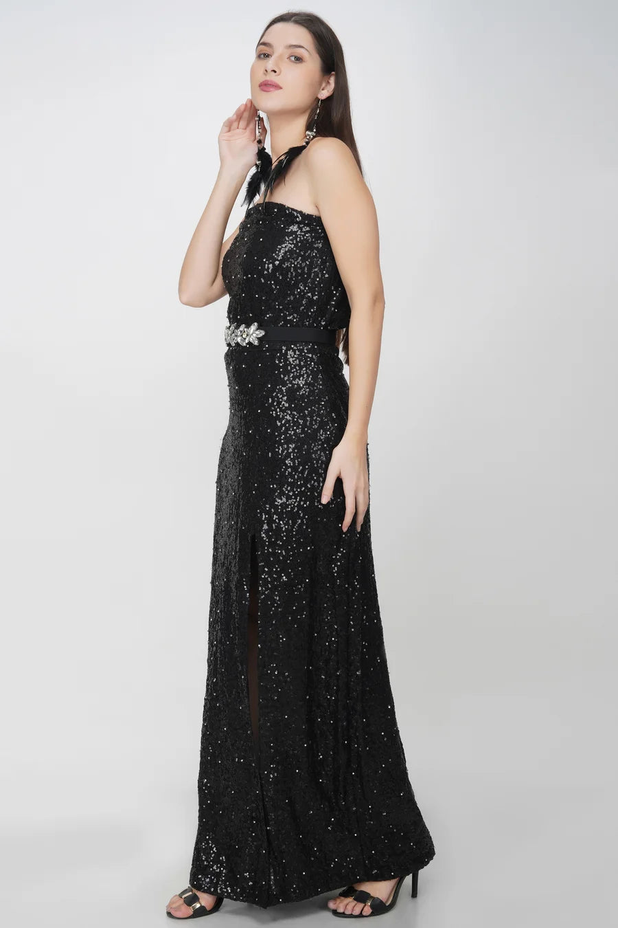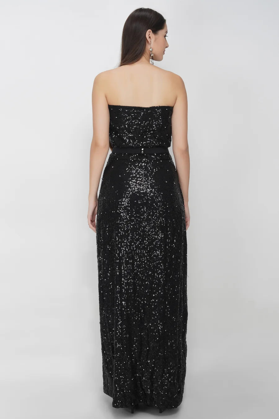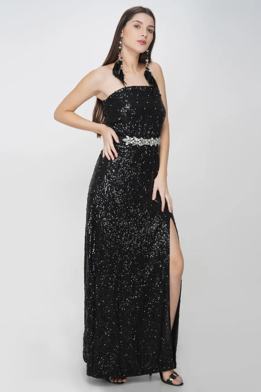 Black Sequins Dress, has a tube style neckline, zip closure on the side, has a full length, party wear western gown design with a thigh-high slit on the side.