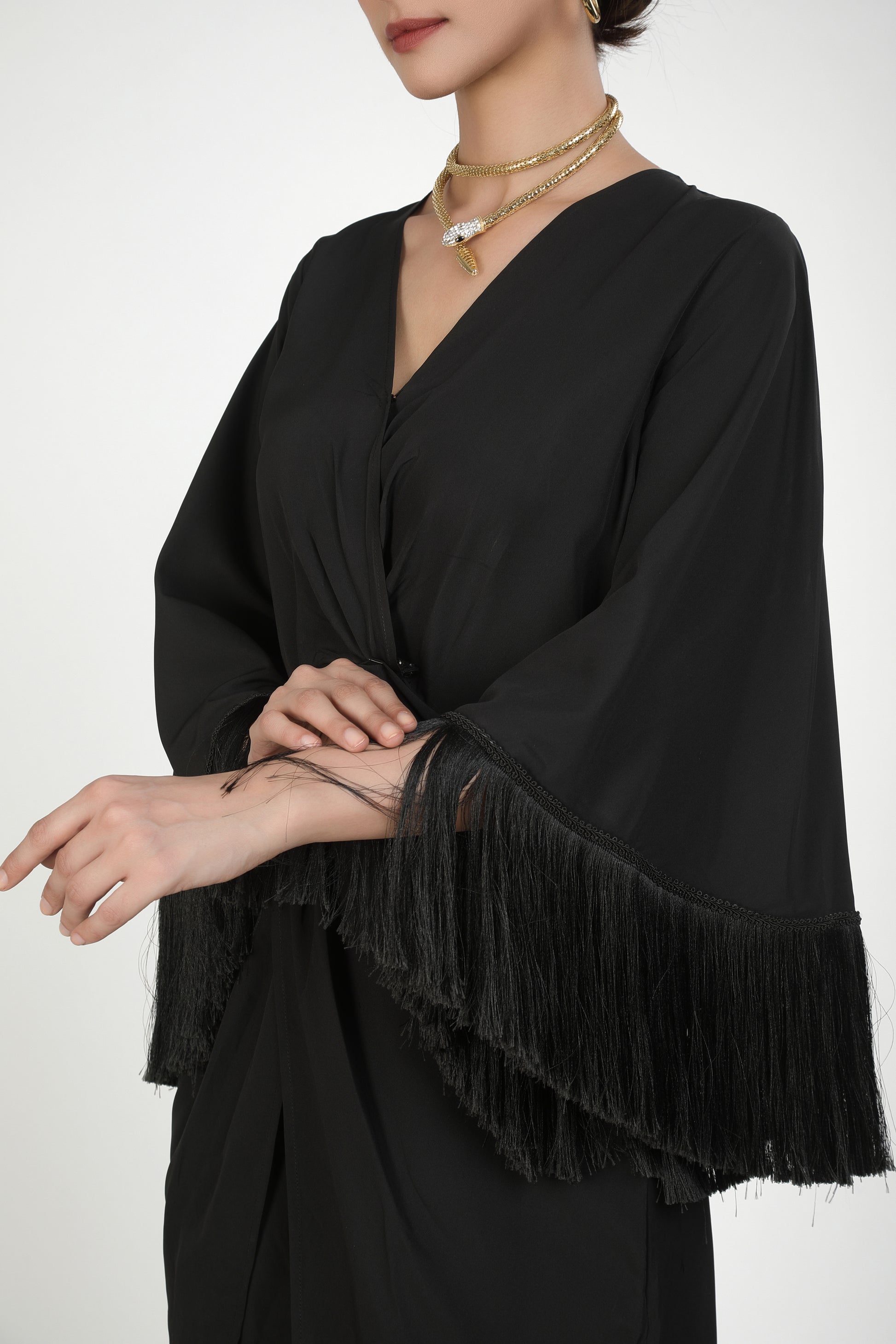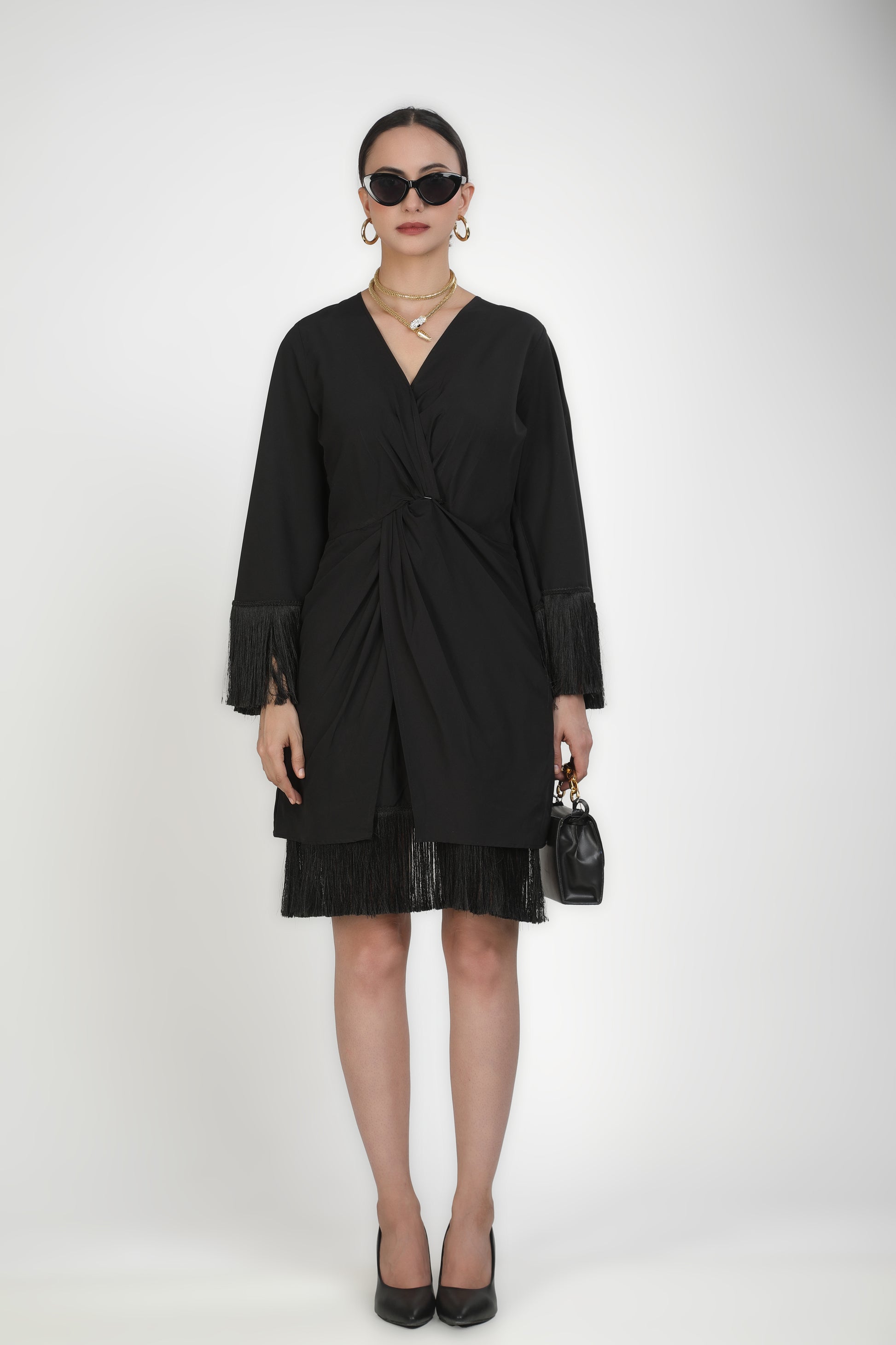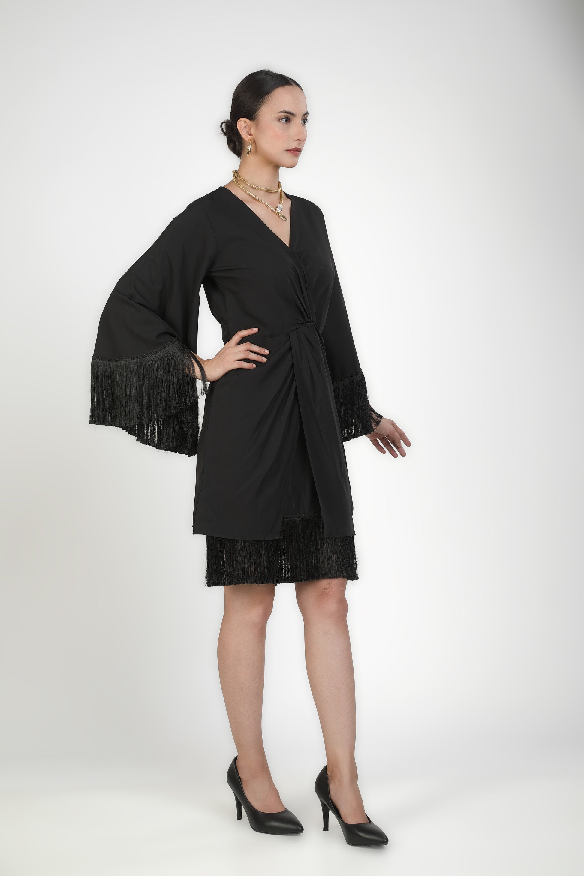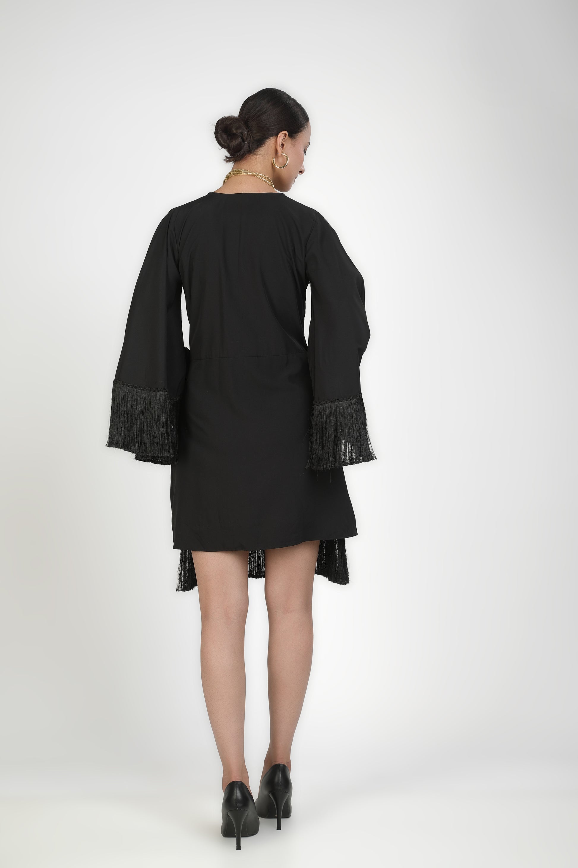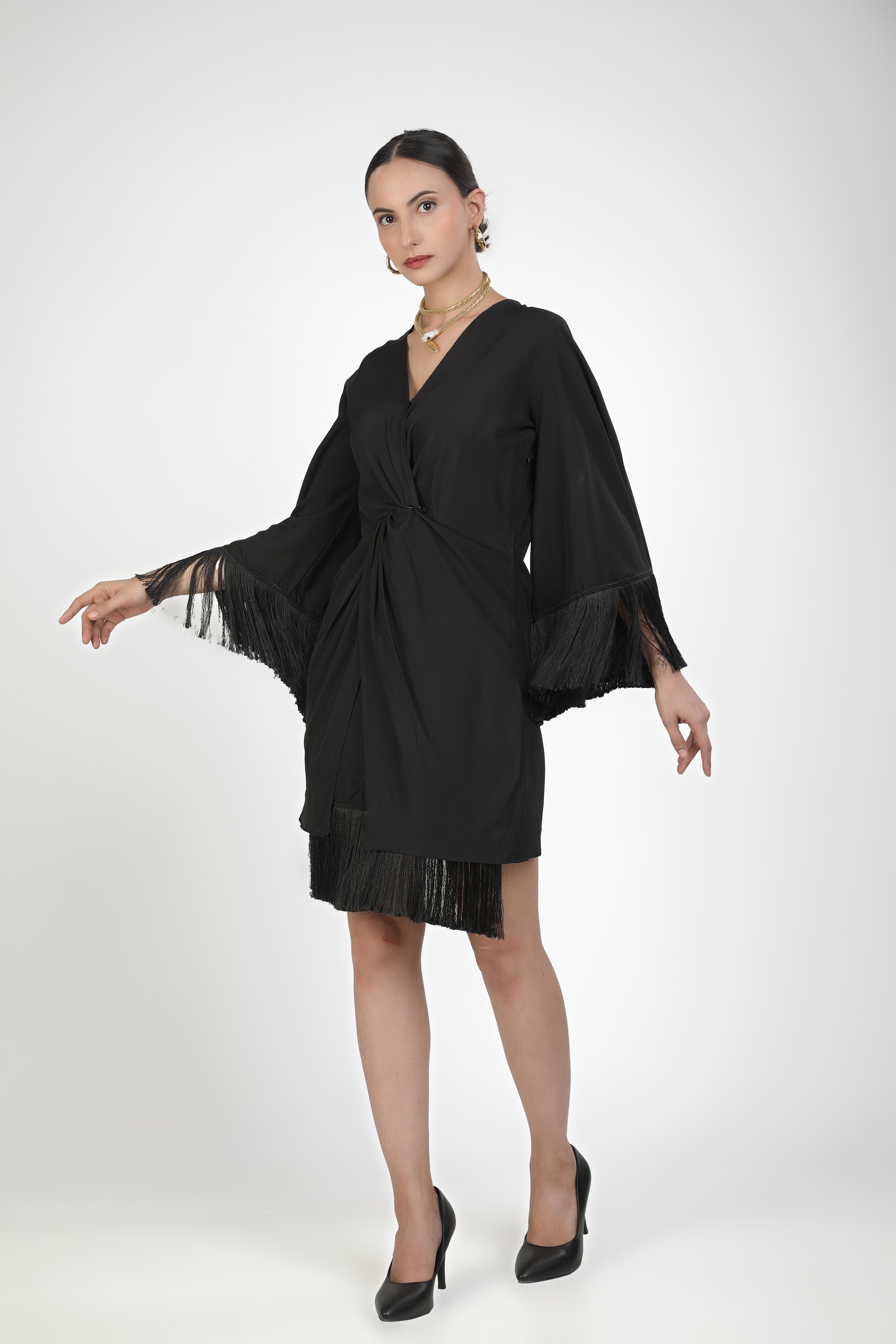 Featuring black twilight fringe criss cross dress based in soft crepe.