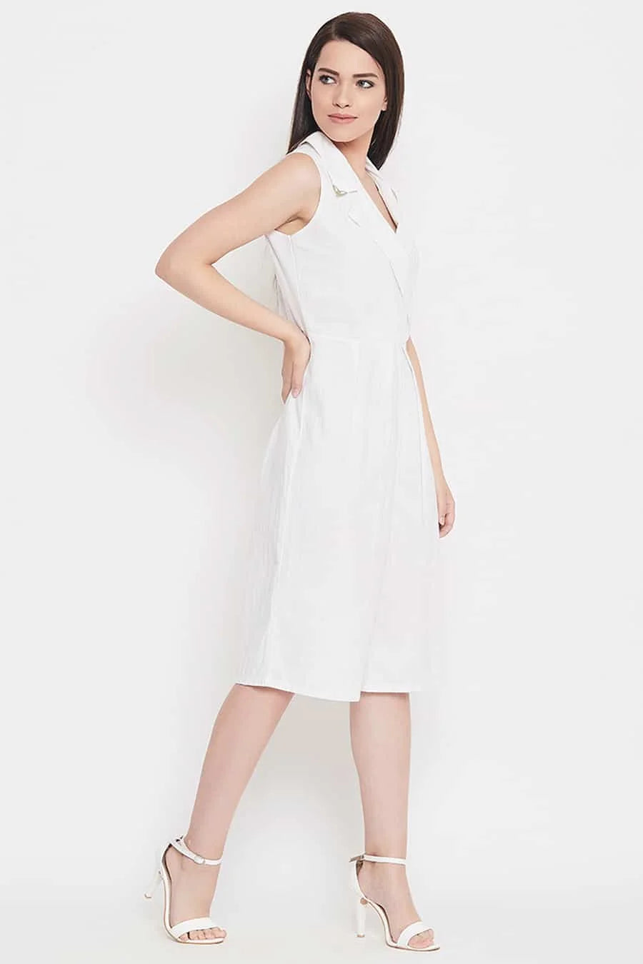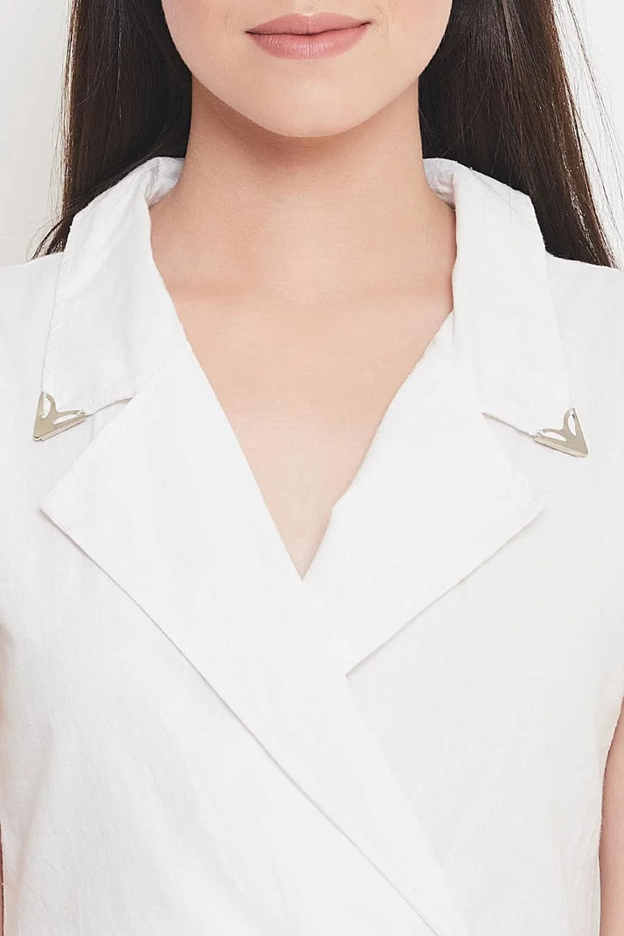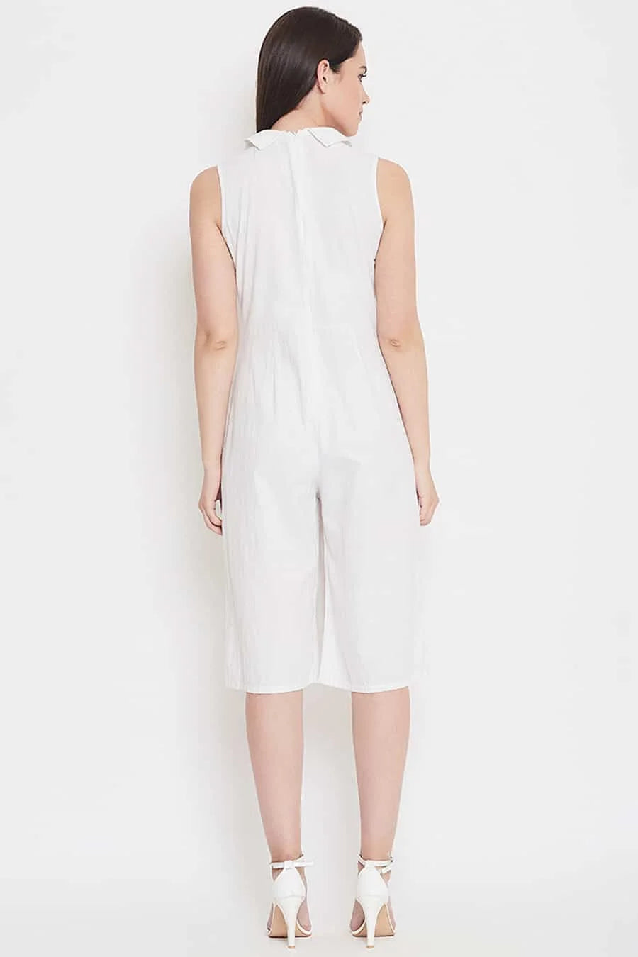 "White cotton linen collared jumpsuit, knee length, cut sleeves, has zip at back. Classy jumpsuit in a classy color. Get your hands in this simple yet classy jumpsuit before it's gone.
