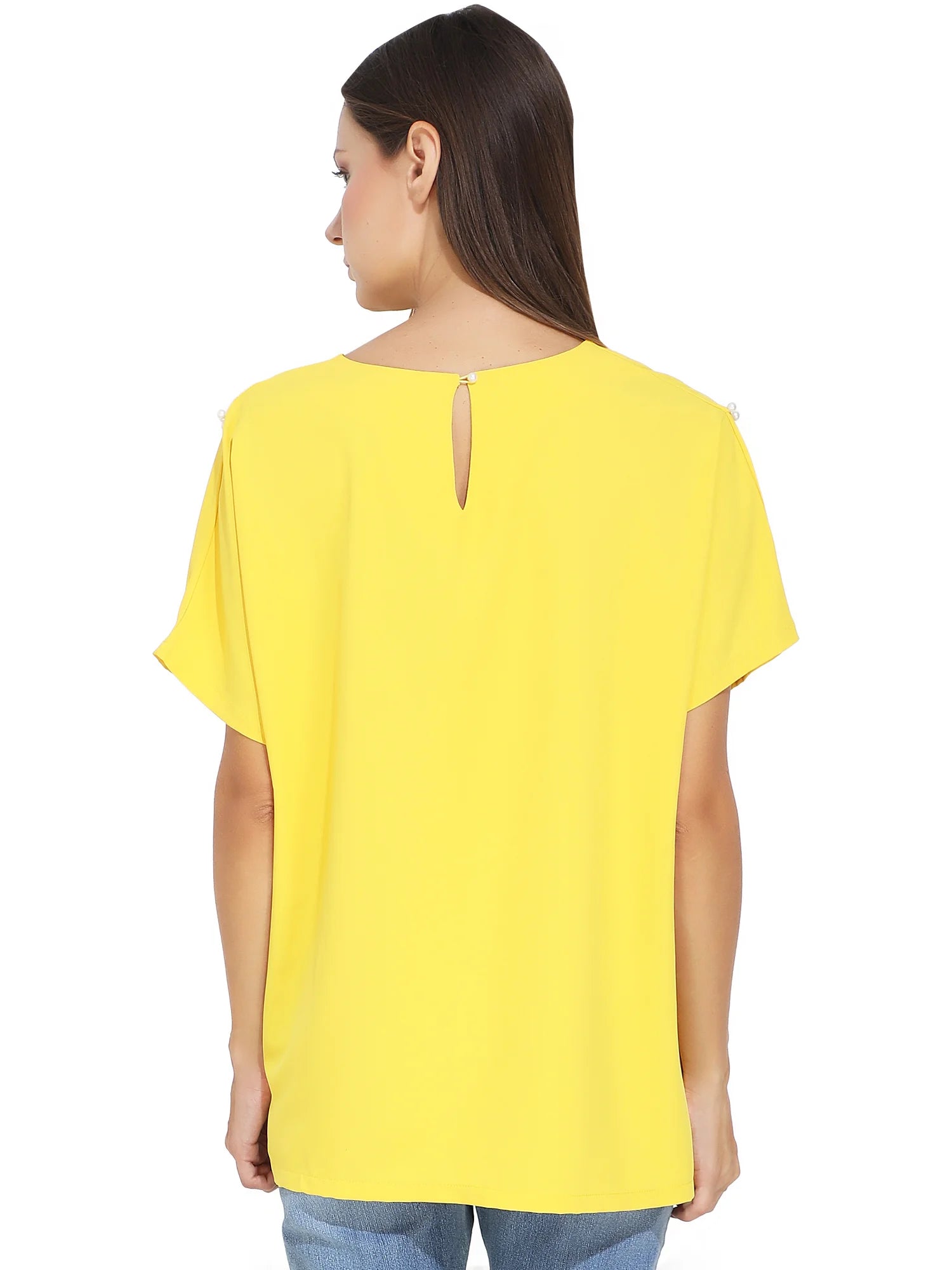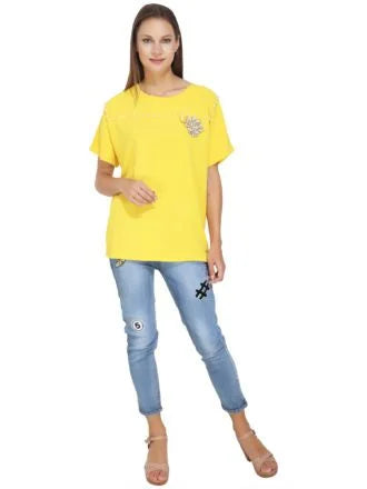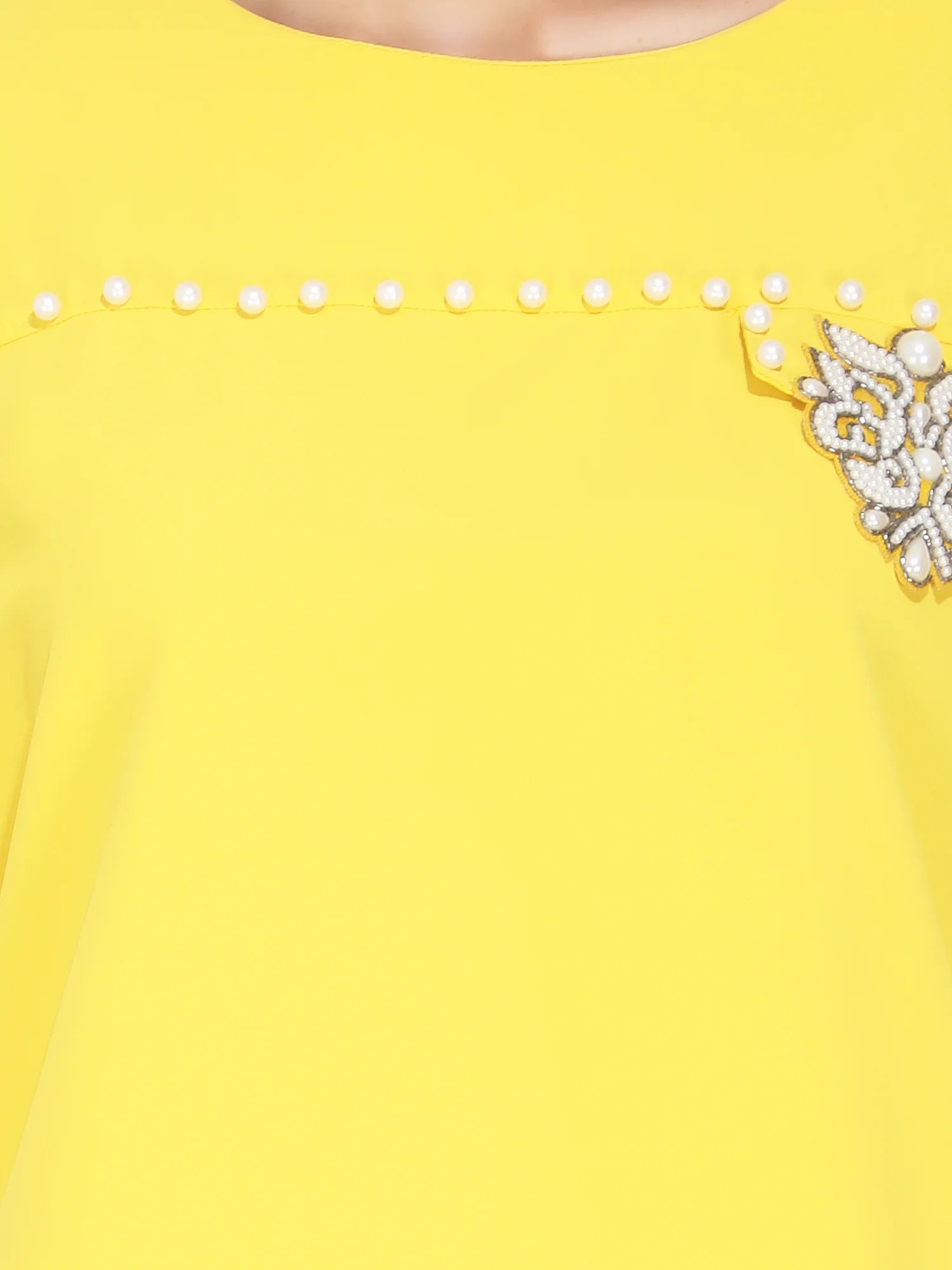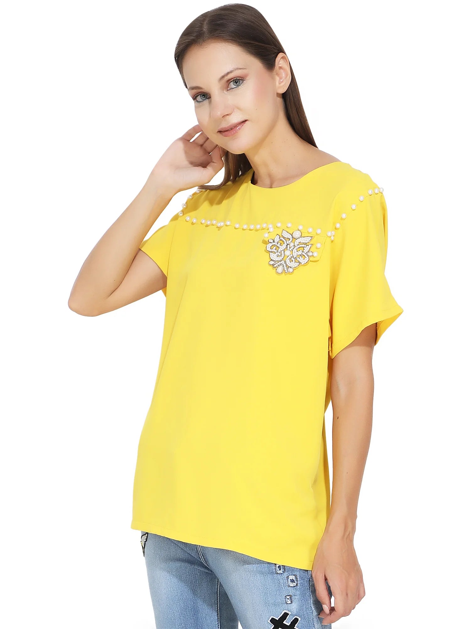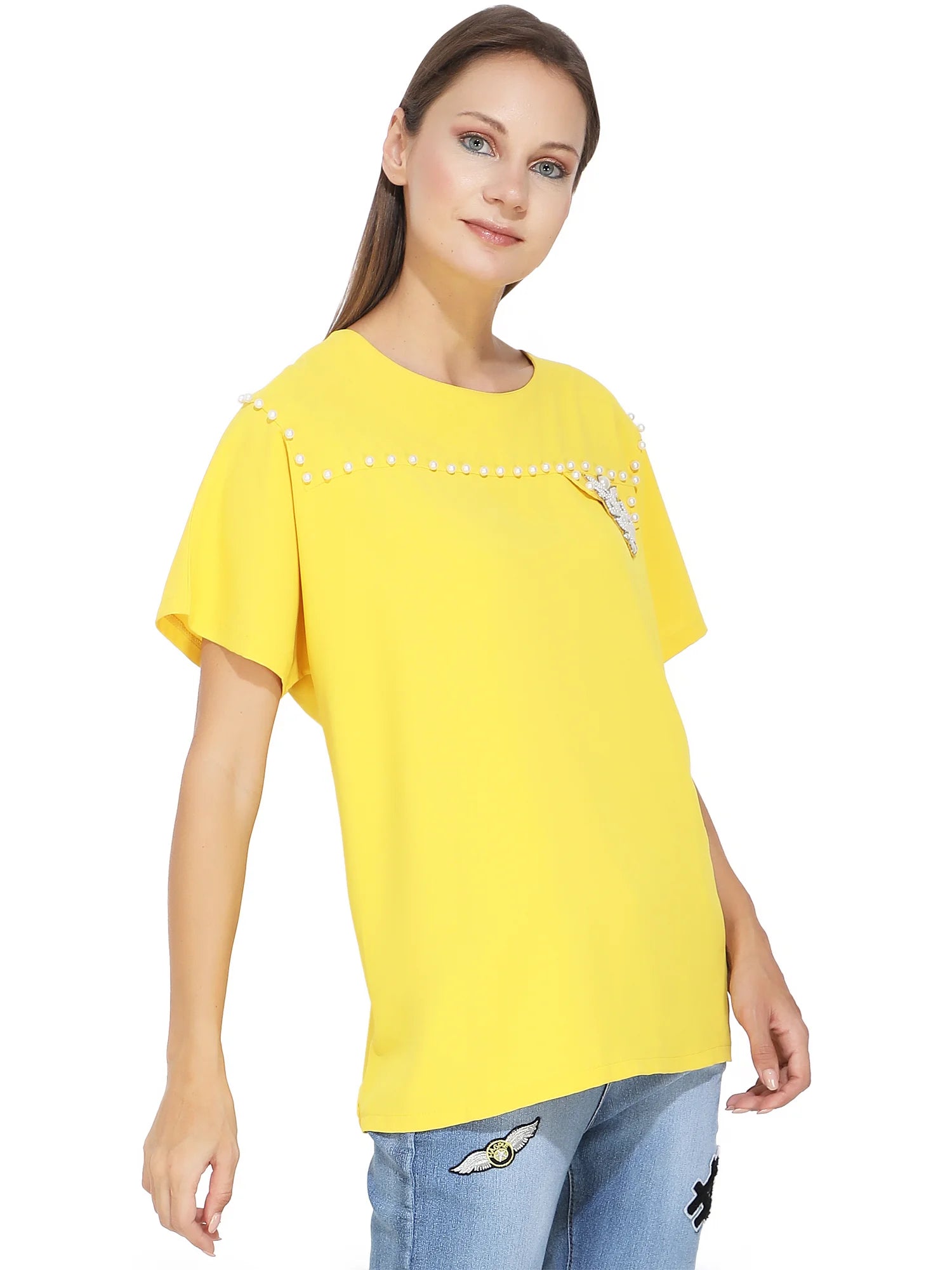 T- shirt with White Pearl Embroidery: The casual t-shirt with a regular fit and highlighted with the touch of pearls. The minimal white pearl studded embroidery is given for enhancement. The t-shirt is made in stain crepe fabric for a softer feel and a glossier look.