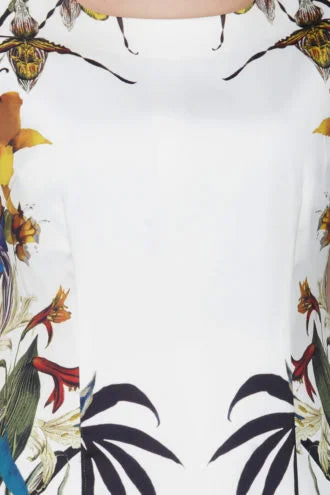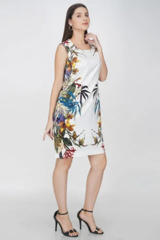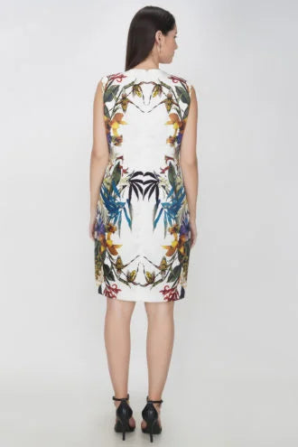 White printed sheath dress, has a round neckline, sleeveless, concealed zip closure at back, and a straight hem.